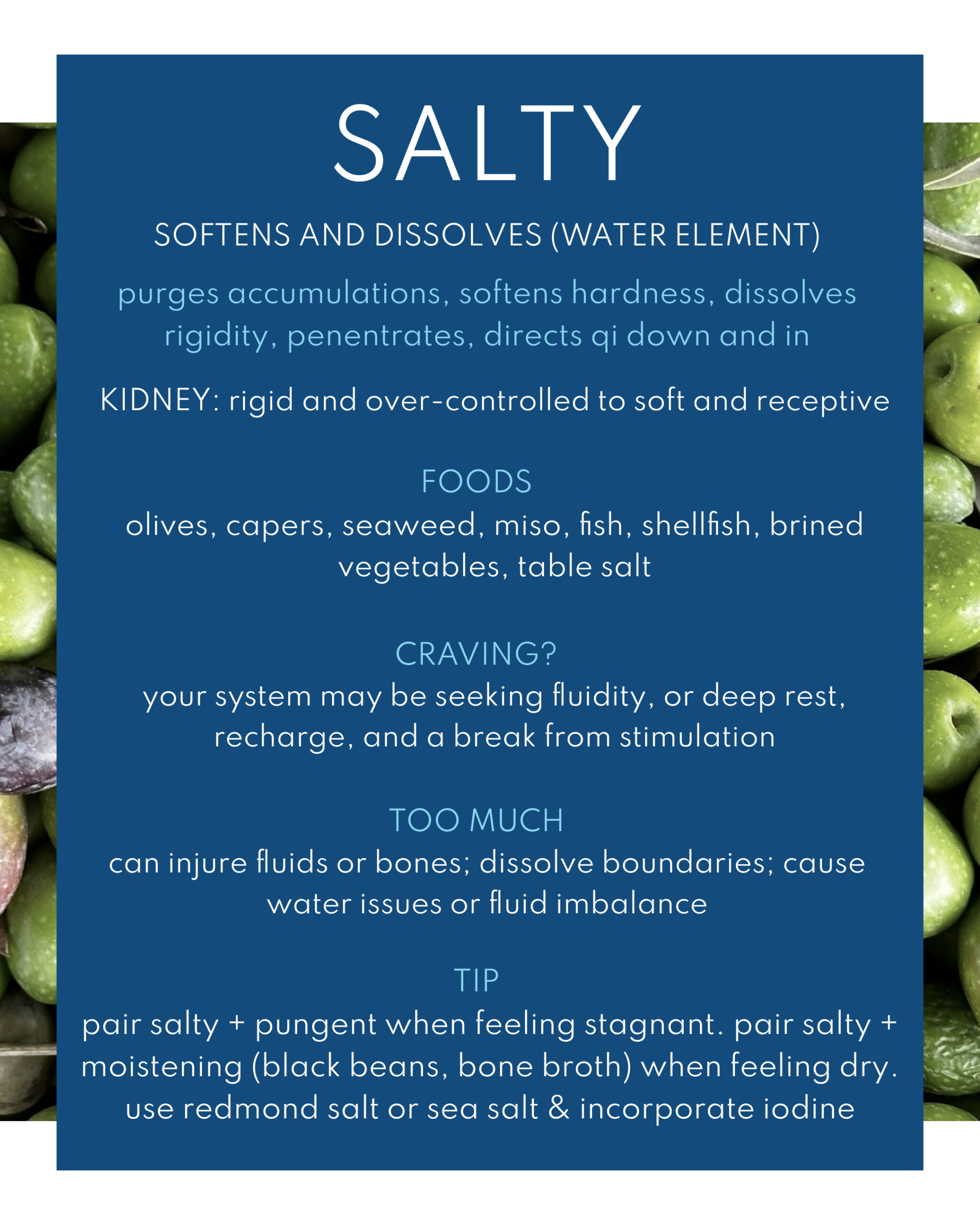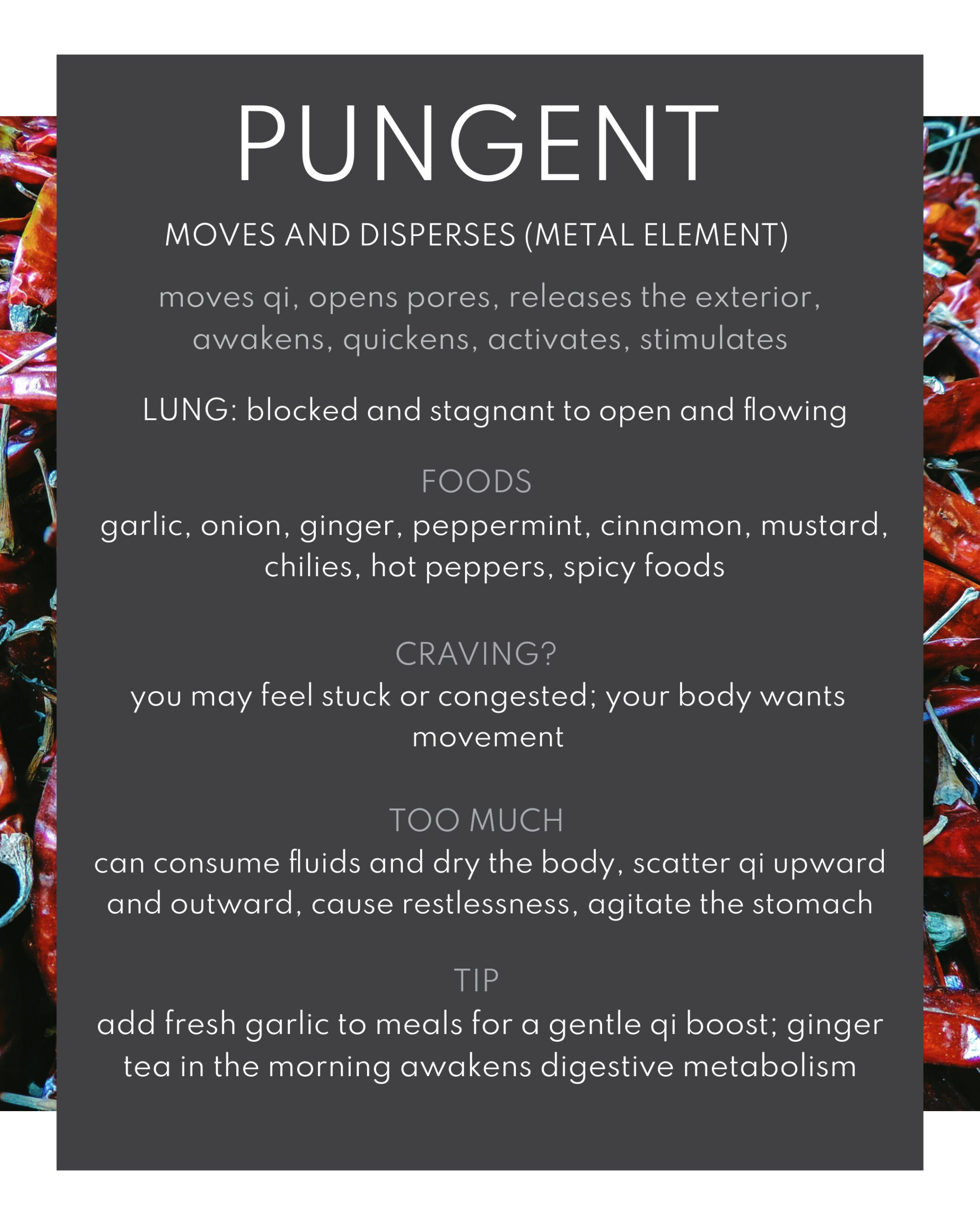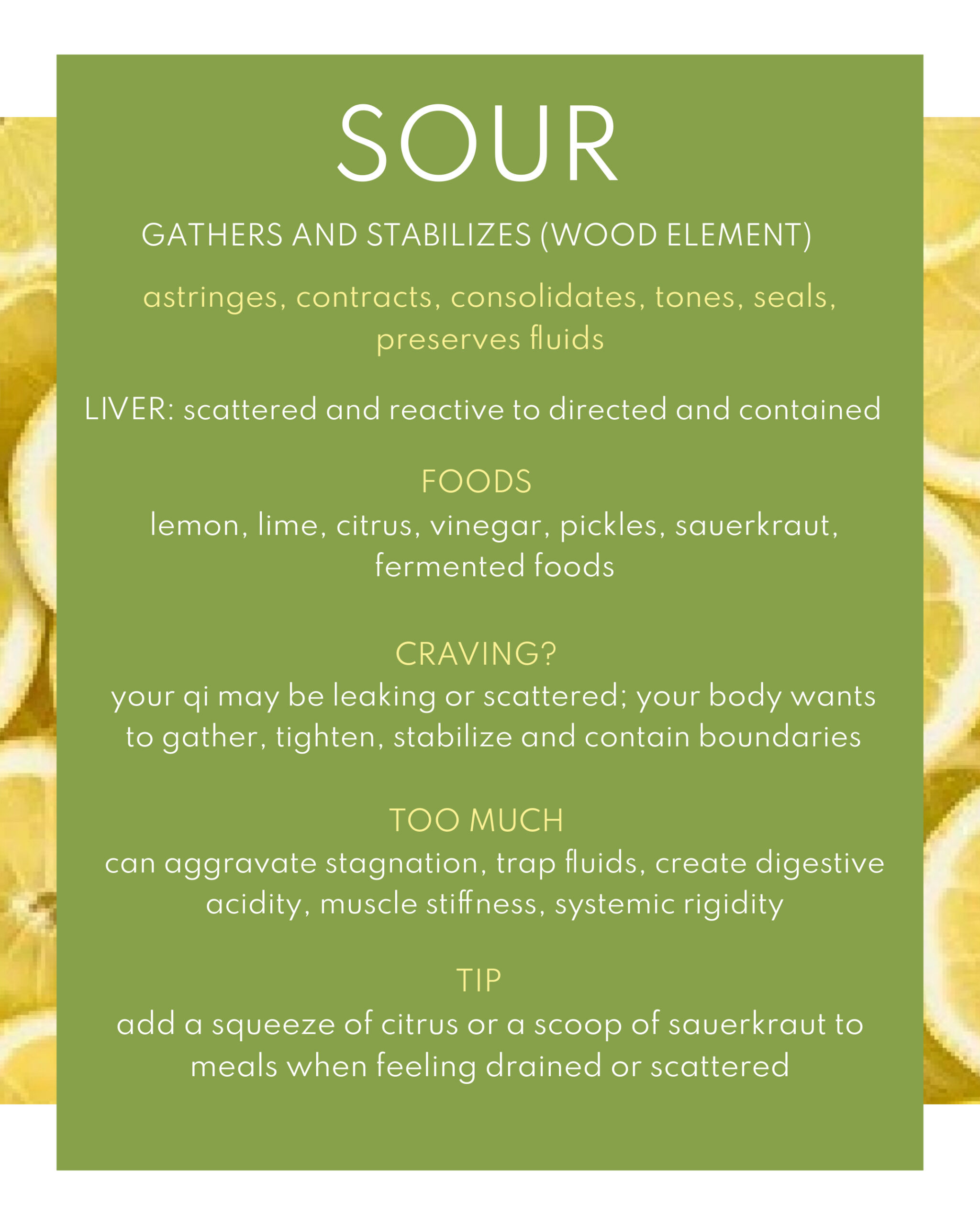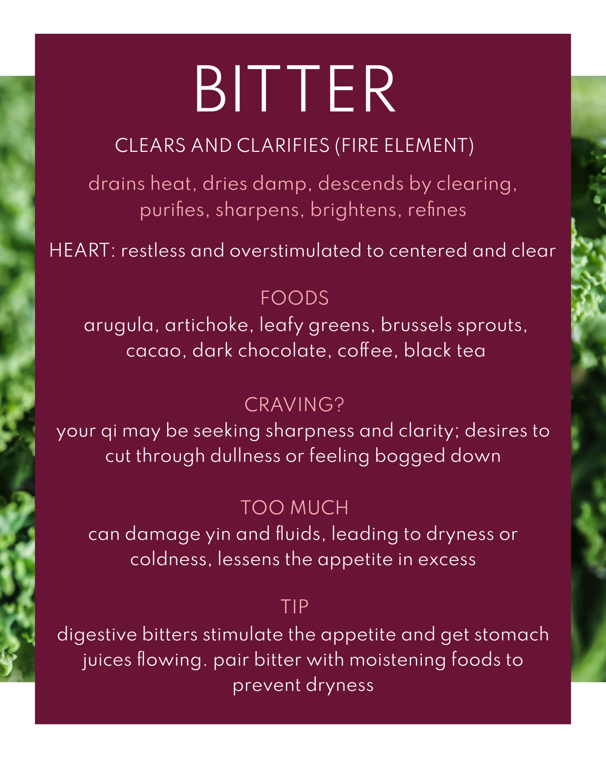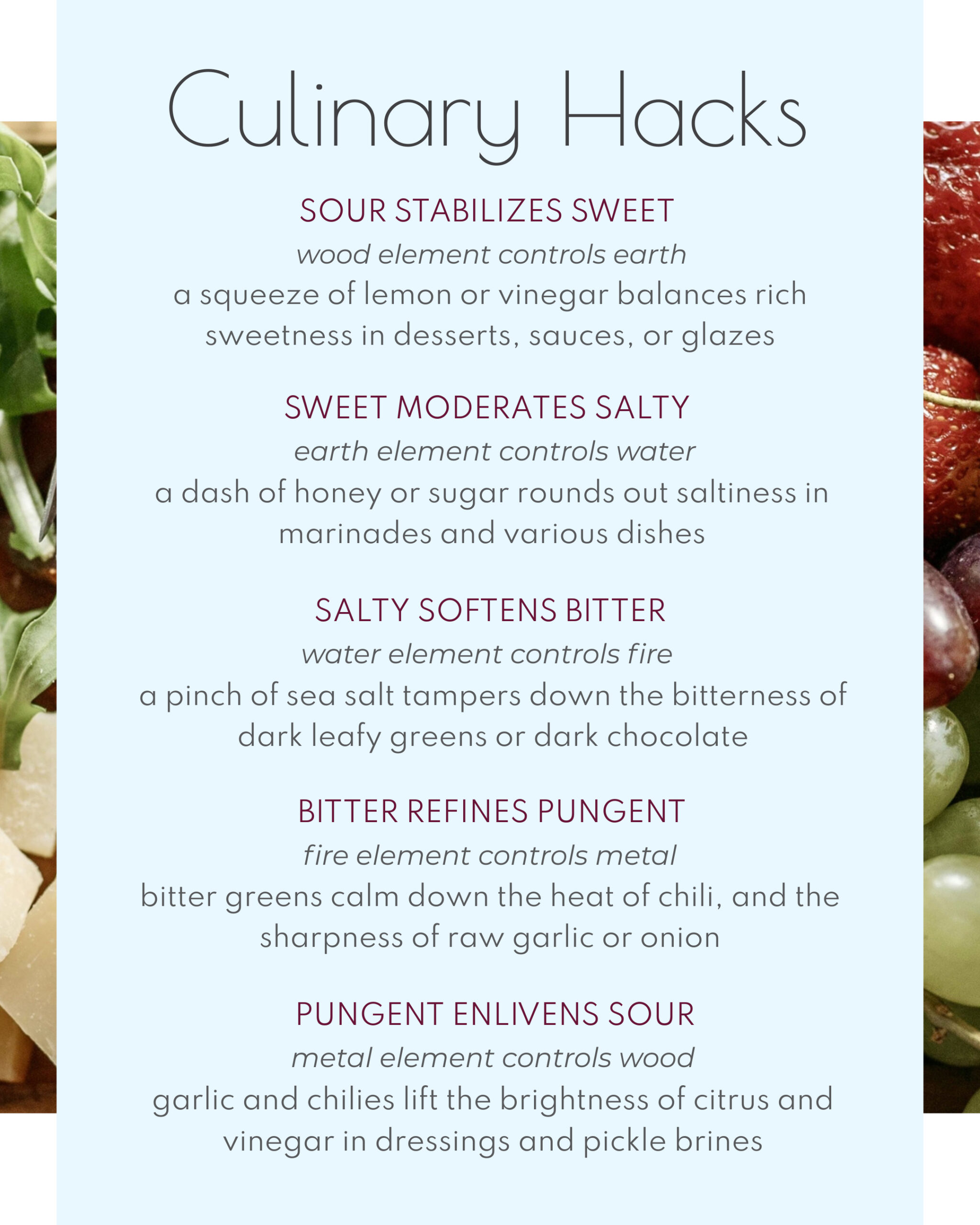 The ancient sages of Chinese medicine discerned that every flavor carries a unique energetic gesture which influences the body, mind, and emotions. Eating what’s in season is the simplest way to follow the natural balance of these flavors, as nature grows what we need.