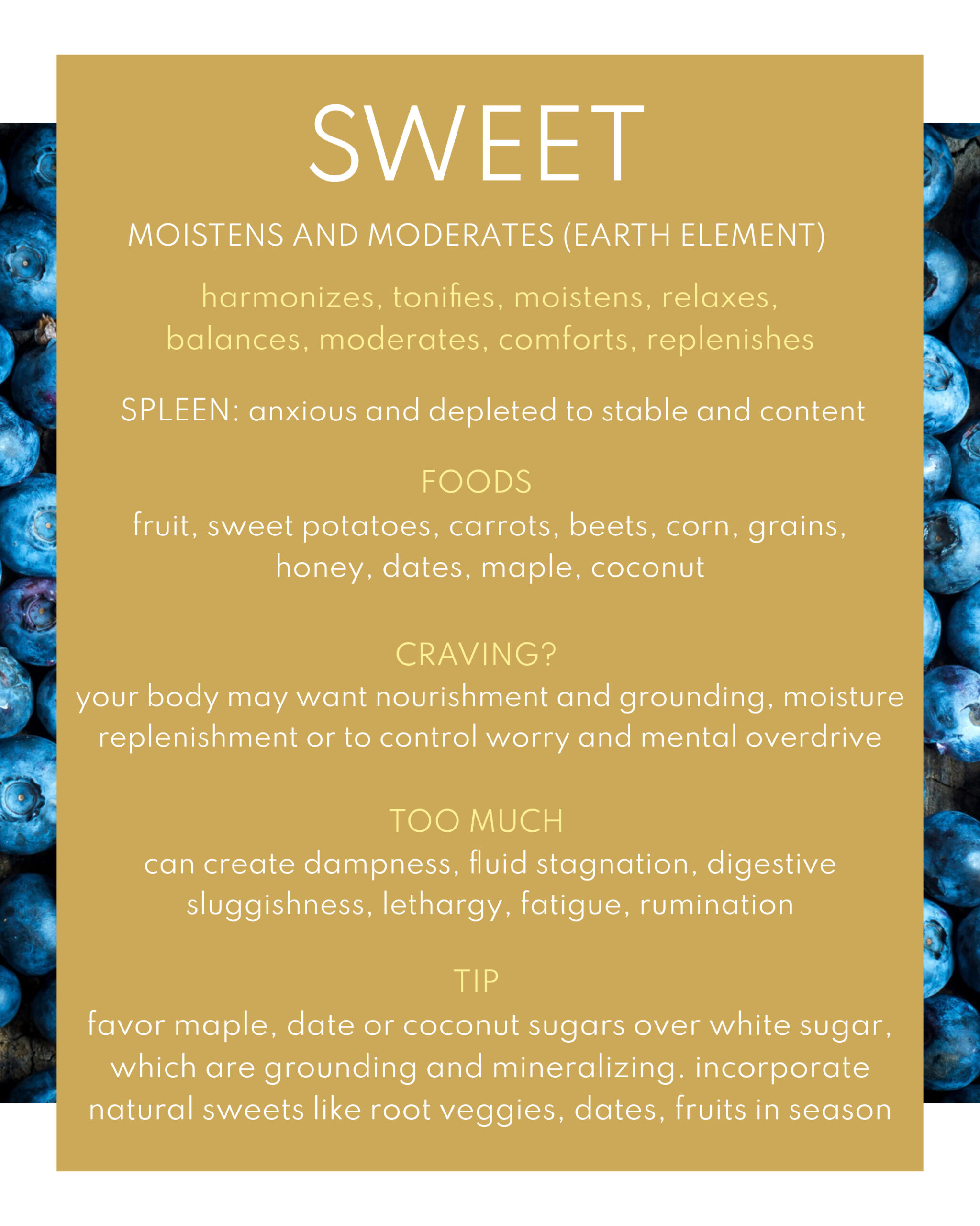 From a Chinese medicine perspective, our digestive center, mainly belonging to the Earth element, first and foremost thrives in a safe inner container of ease, nourishment and enjoyment. Listen to your belly. Let food bring you warmth, nurturance and joy rather than guilt, rigidity or suppression of your needs.